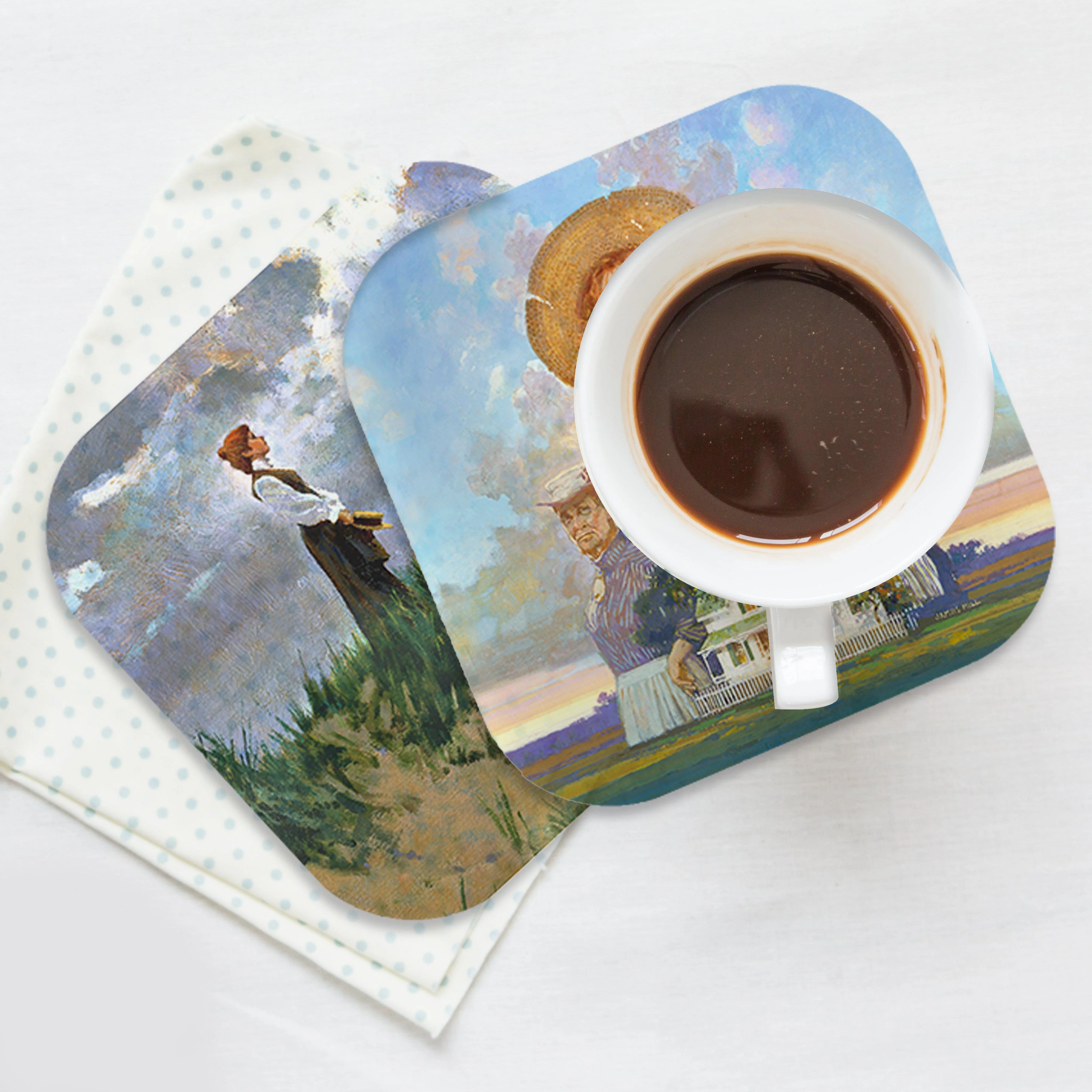 These four high-quality coasters feature Anne of Green Gables inspired images by celebrated Canadian painter James Hill.