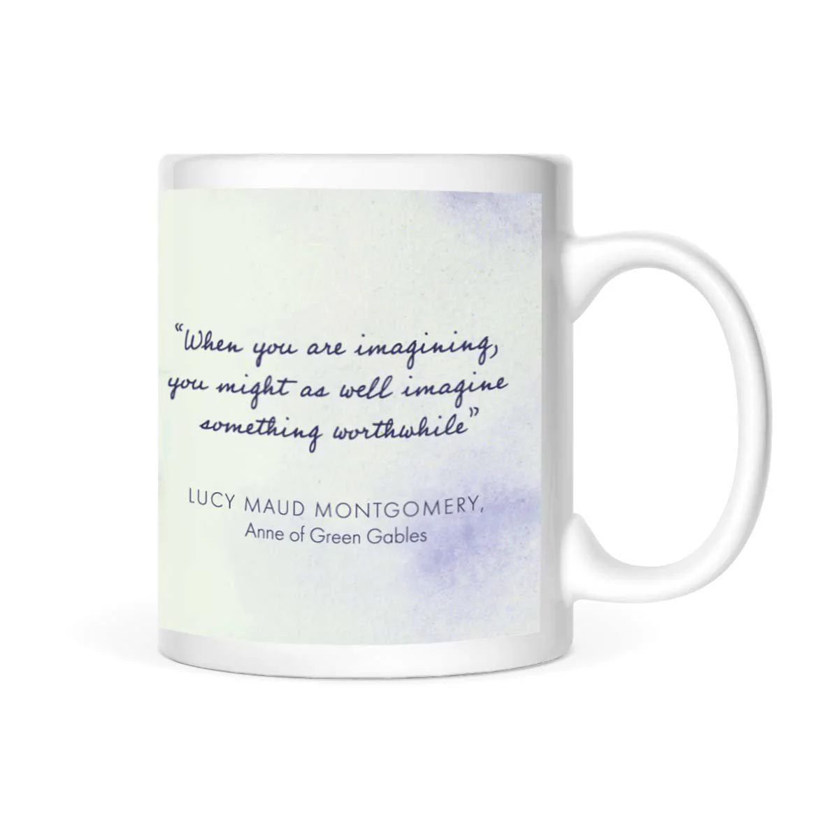 Have your favorite beverages in this mug featuring a watercolor rendering of "Green Gables" by artist Diane Henderson and the L.M. Montgomery quote "When you are imagining, you might as well imagine something worthwhile."