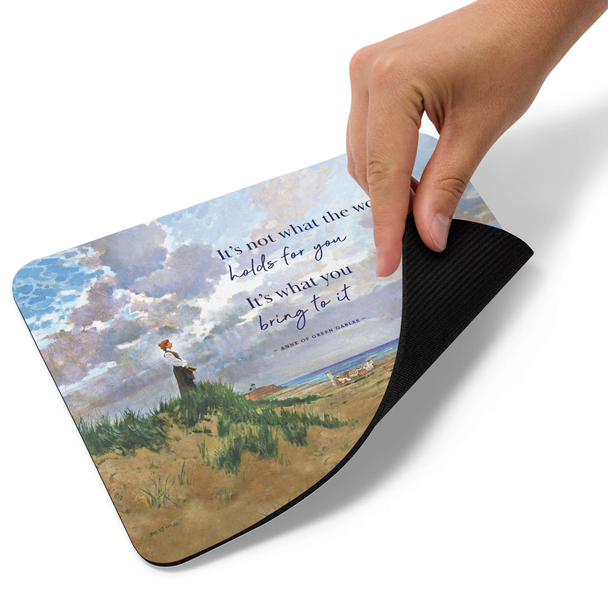A mouse pad featuring an image of Anne Shirley, by James Hill, and the quote, "It's not what the world holds for you, it's what you bring to it."